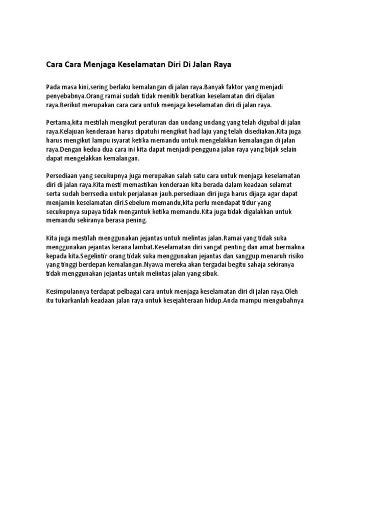 Ulasan Karangan Keselamatan Jalan Raya - Contoh Karangan. Sulit 1 032 bahagian a 10 markah masa dicadangkan. Jangan gopoh gapah semasa memandu kerana kecuaian menjadi punca nyawa sendiri . Kemalangan sebegini biasanya boleh membawa kecederaan dan juga . Ulasan kes ganti rugi dalam kes kemalangan jalan raya. Cikgu sabar mohd karangan tingkatan 3 langkah langkah mengelakkan kemalangan jalan raya.